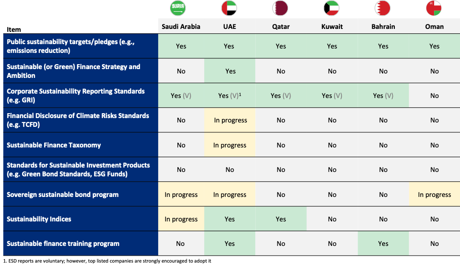 To avoid falling behind on their grand economic growth ambitions, GCC countries should act decisively by putting sustainable finance policies at the top of their agendas. As the case of the UAE shows, the first step is to develop a comprehensive strategy, which should introduce standards for sustainable investment products, sustainable finance taxonomy, and climate-risk disclosure at minimum.