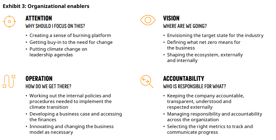 Through our conversations with practitioners, the broader quantitative survey, and our ongoing consulting work, we have identified four core enablers that make corporate action on climate happen (see Exhibit 3).