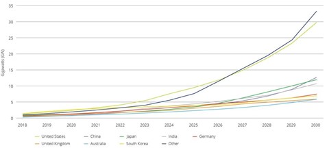 Greater storage capacity and the rapidly declining cost of battery units are driving a global rise in demand. Bloomberg predicts that by 2030, demand for lithium-ion (Li-ion) battery capacity will have increased to 9,300 GWh globally — over 10 times the current demand.