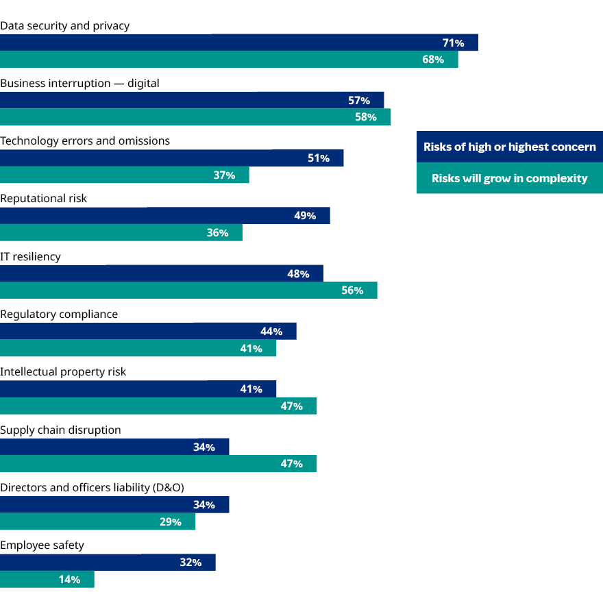 The top three risks in this year’s report — data security and privacy, digital business interruption, and technology errors and omissions — have consistently ranked as top risks for all nine years of this report. IT resilience, which is closely linked to the top three risks, remained in the top 5, the same as last year.