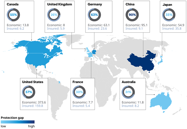 Note: Economic and insured loss data for the United States includes tropical cyclones; data for China and Japan includes floods and tropical cyclones; data for France, Germany, and Canada includes floods and severe convective storms; data for Australia includes floods, tropical cyclones, and severe convective storms. Data: Swiss Re.