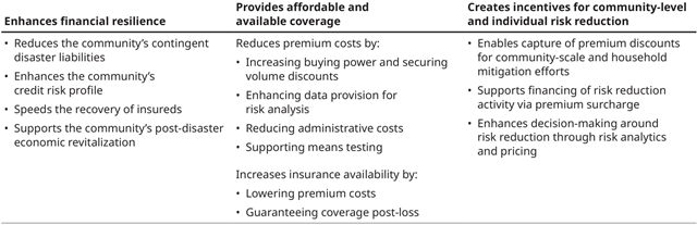 The benefits of CBCI fall into three main areas: enhancing financial resilience; providing affordable coverage; and creating incentives for risk reduction at the community and individual level (see Exhibit 2).