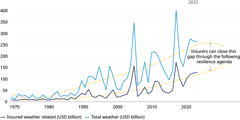 Supporting adaptation and resilience in the face of climate change is not just an opportunity, but a commercial imperative for the insurance industry. Currently, only 43% of global weather-related losses are insured, equating to a $132 billion protection gap (exhibit 1). While this gap exists for a multitude of structural and socioeconomic reasons that cannot be solved by the insurance industry alone, insurers can pursue strategies that may help narrow the gap.