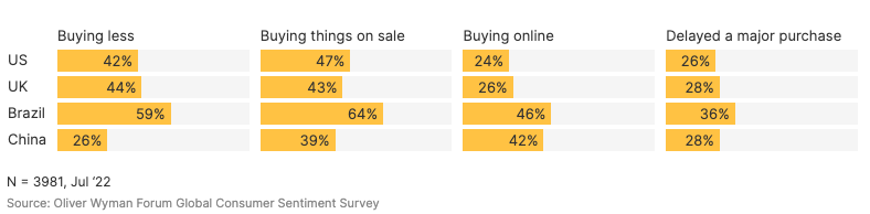 Businesses can’t afford to wait for stability. Higher food and energy prices already are impacting consumers, forcing them to change how they shop, save and work. More than 40% are buying less, and over a quarter are delaying major purchases, according to a monthly survey of consumers in the United States, the United Kingdom, China, and Brazil by the Oliver Wyman Forum.