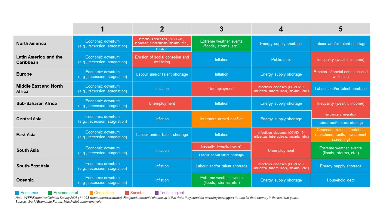 Record levels of inflation, a pervasive cost-of-living crisis, energy supply challenges, and the extreme weather events that devastated communities in many countries drove a relatively consistent set of top business leader concerns across regions. The strength of sentiment on these issues resulted in a lower profile for geopolitical and technological risks.