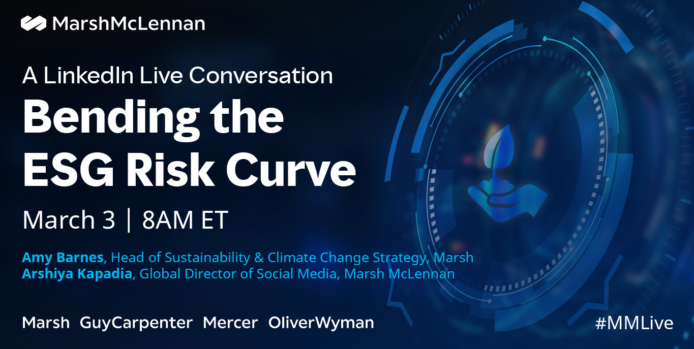 Listen to the replay of our LinkedIn Live discussion on bending the ESG risk curve with Amy Barnes, Marsh's Head of Sustainability & Climate Change Strategy, and Arshiya Kapadia, Marsh McLennan's Global Director of Social Media.