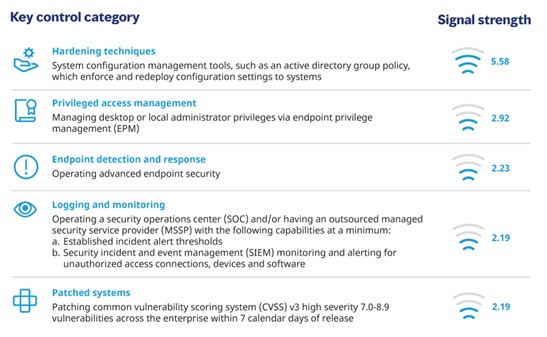 Among the hundreds of cyber capabilities, tools, and implementation techniques analyzed and measured, the report focuses only on those falling within the 12 key control categories commonly required by cyber insurers. Among those, the top five controls determined most effective are: