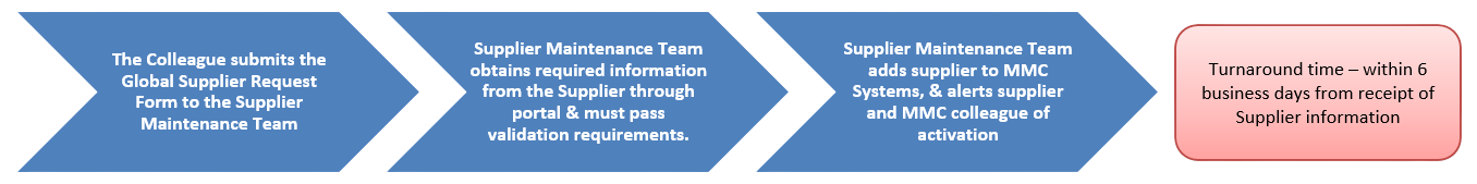 Supplier activation or modifications requires collaboration between the MMC Business Owner, Global Supplier Maintenance Team, and Supplier.